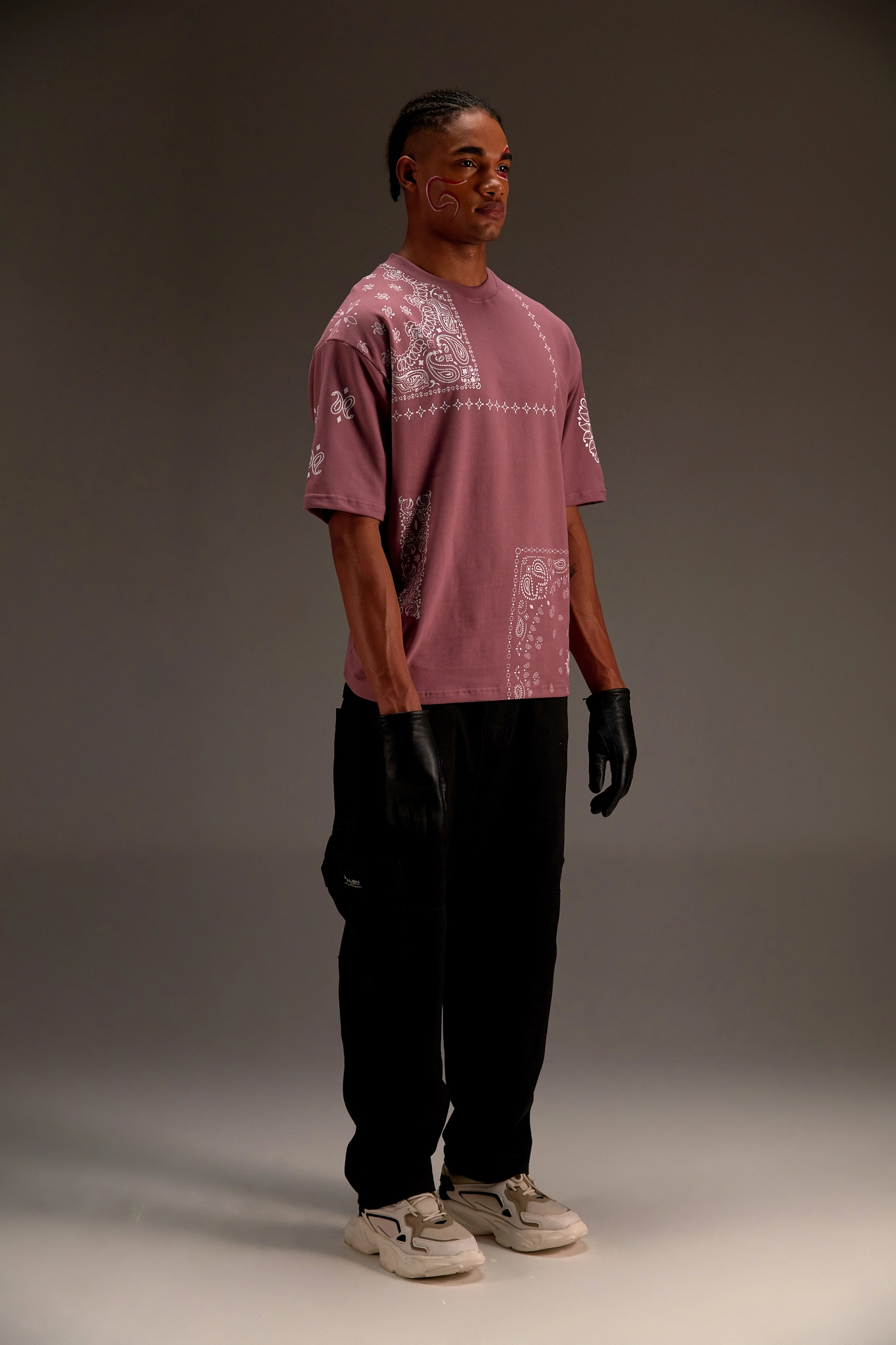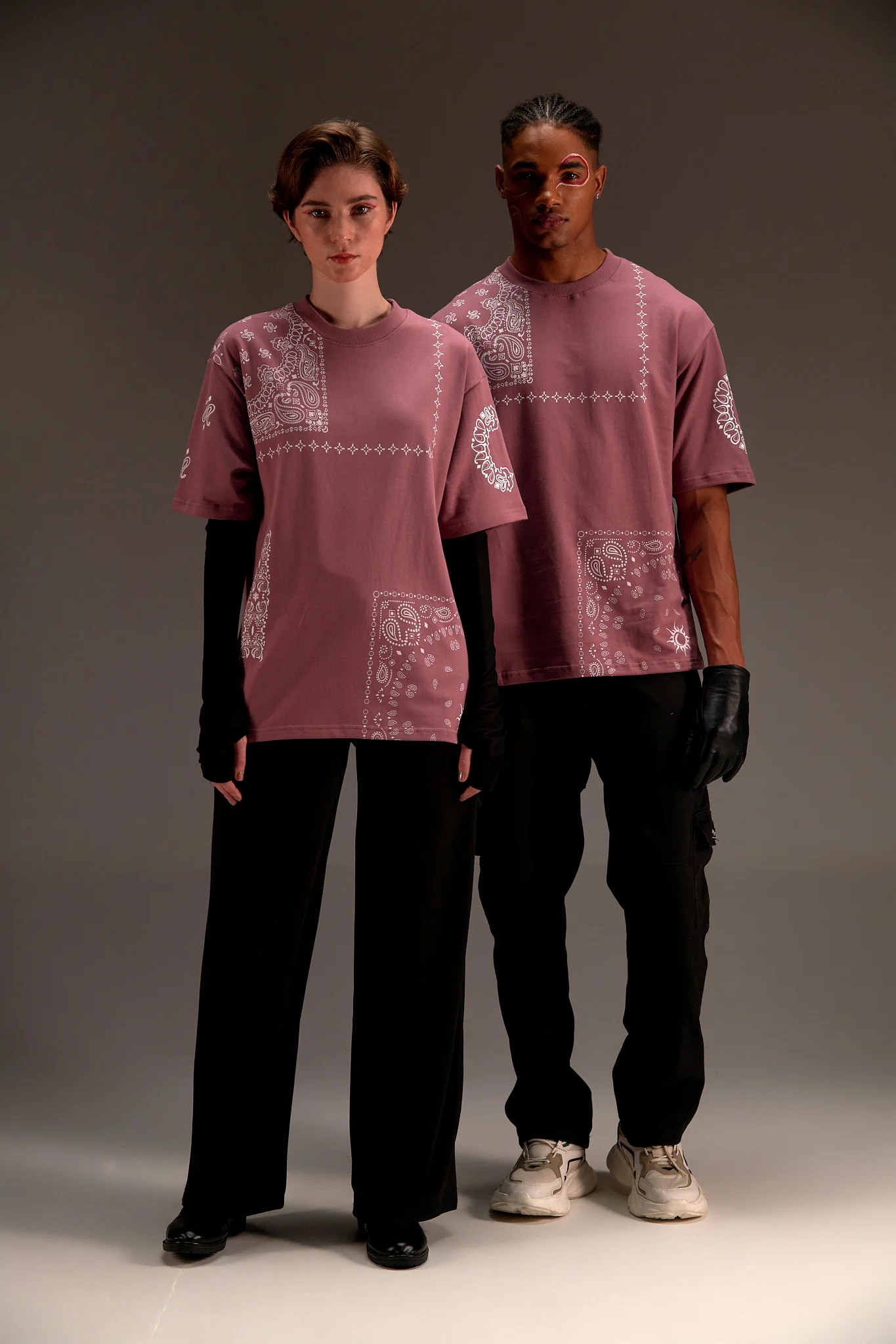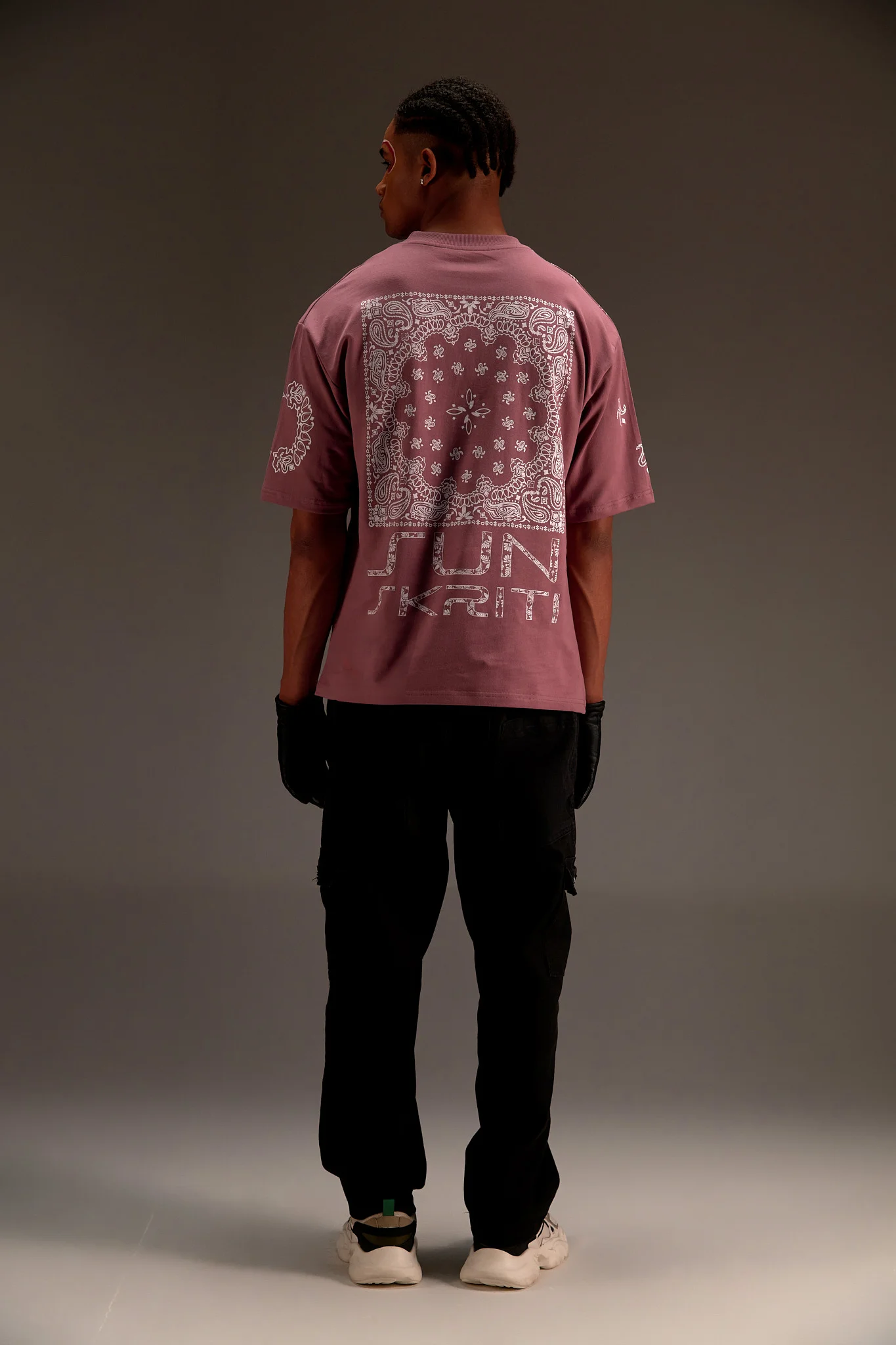 Inspired by traditional art, Sun-Skriti brings together expressive and aesthetic design with a creative twist. This onion color drop-shoulder tee adds a unique touch to the classic bandana pattern. This is made from comfortable and durable 240 GSM cotton loop-knit fabric. The screen-printed design gives depth to the pattern, making it a statement of individuality and creativity.